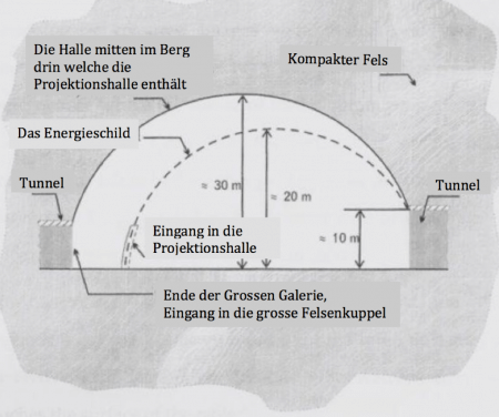 For unknown reasons, the corridor, the Great Gallery, bends sharply to the right after 280 meters, the same mystery for the scientists was the material from which the walls were made. The large gallery then turns to the left before the end, opening into a 4-meter hall, which turns into a huge dome of the rock and opens a beautiful view of the space, which was named the Projection Hall. At a distance of about 7 - 8 meters from the entrance to the hall, a protective energy dome begins to rise and prevent entry. It spans most of the hall, emitting breathtaking blue light that flashes bright rays. There is only one access to the hall through the dome, it is a gate which, when you approach the gable from the Great Gallery, is first transparent and then disappear completely. The protective dome gives the impression of a perfect holographic projection, but it consists only of energy. Like the first closure at the entrance to the Great Gallery, the inner shield withstands any attempt - other than the location of the gate, to penetrate or damage it. From the inside, the dome is no longer blue, but golden-white and emits a very pleasant light. The back of the hemisphere is bounded by the rock wall of the hall.